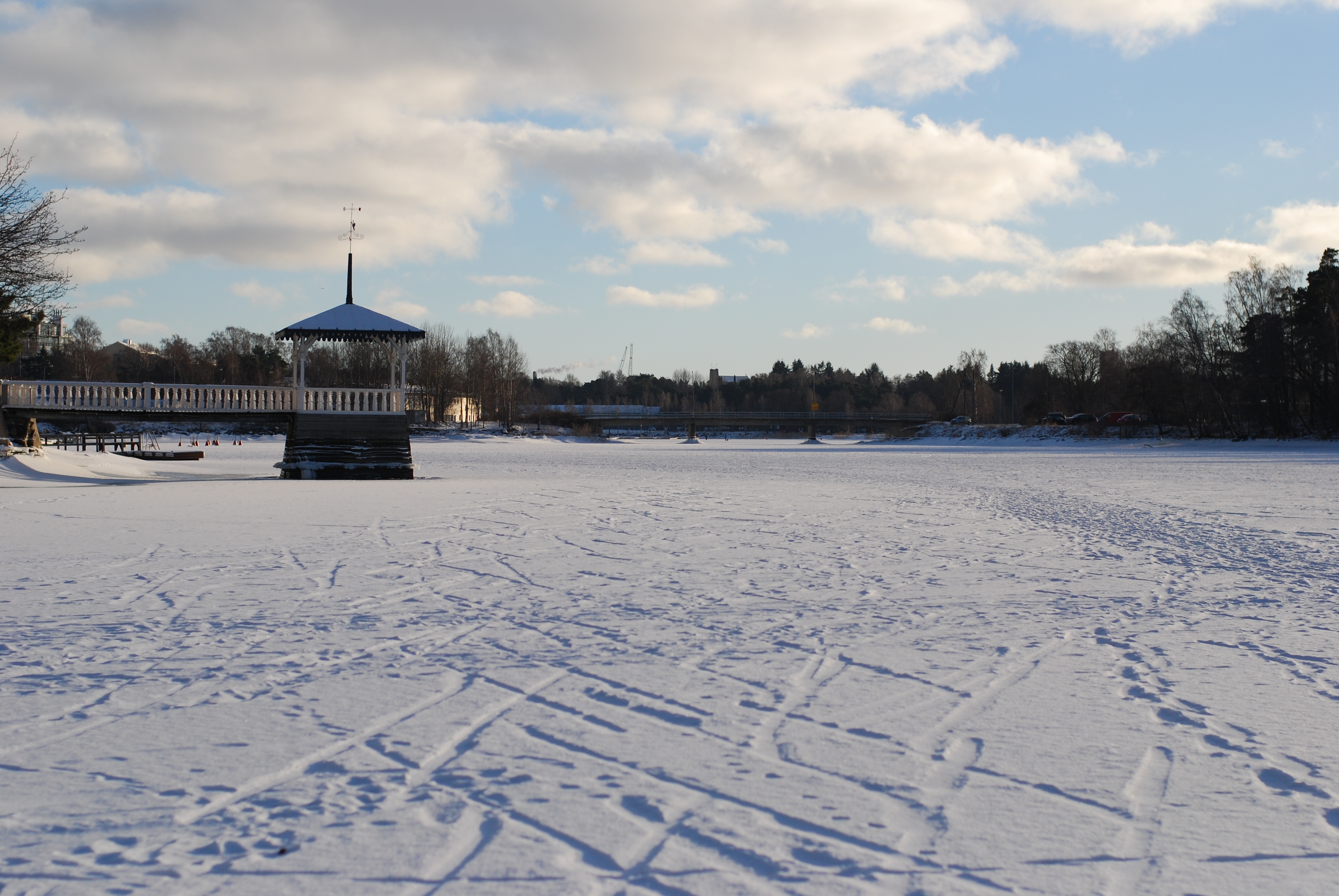 Trochu se tu zatáhlo, ale už to opět vypadá nadějně. Ville fotil. Byli jsme fandit malým florbalistům, byli moc rádi. Chodíme často bruslit, možná se i jednou naučím jezdit tak, abych nevypadalo jako tučňák. Už se dá chodit po ledu – všimněte si, jak jsou ty stopy od lyží díky větru vyvýšené. Poté, co se na nich někdo projel po zálivu, vítr odvál okolní nestlačený sníh, a típ pádem ta stopa jakoby vystoupila na povrch. A vybrali jsme Martě kočárek.